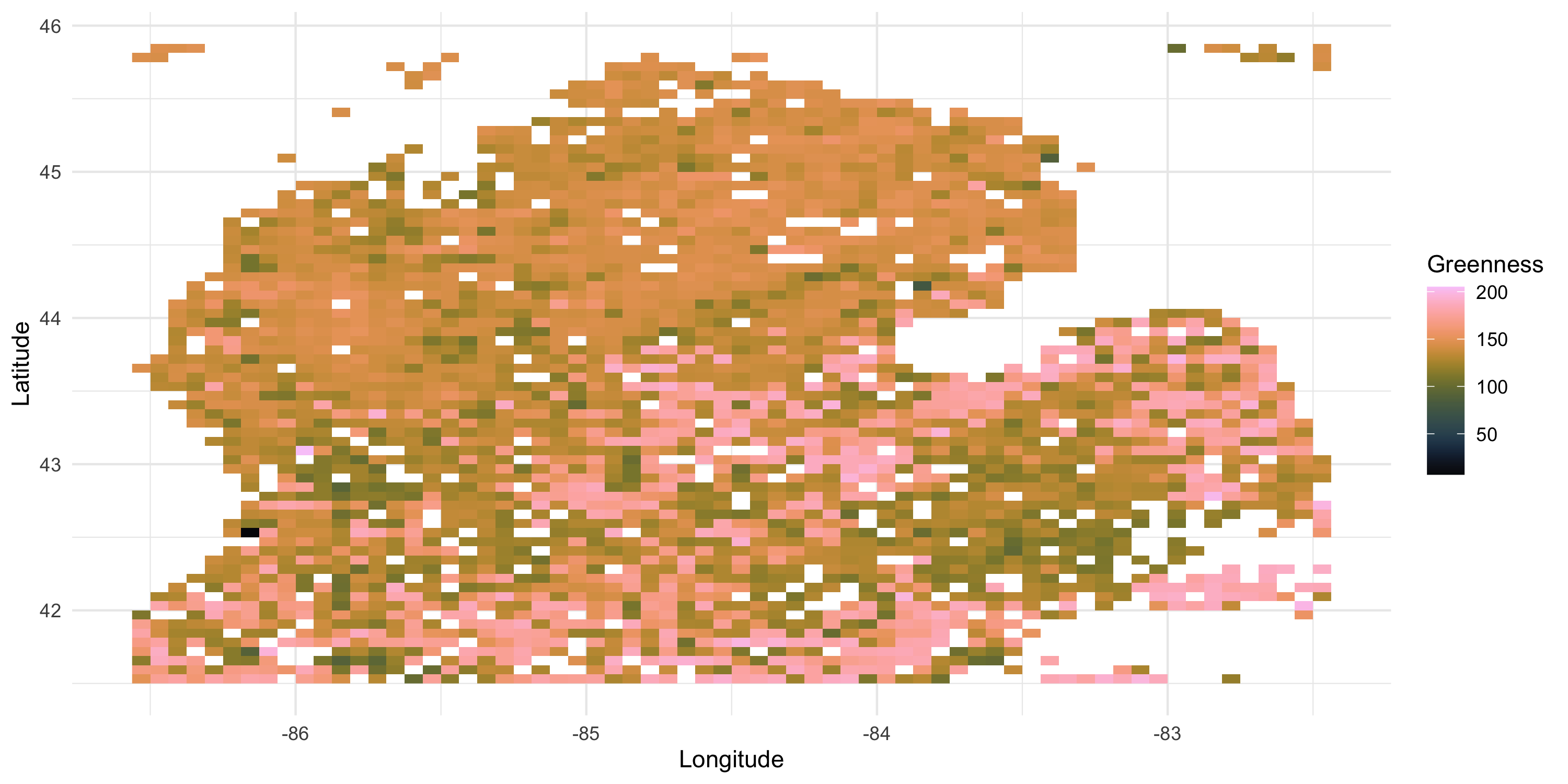 (data_plot <- ggplot(df, aes(Longitude, Latitude, fill=Greenness)) +