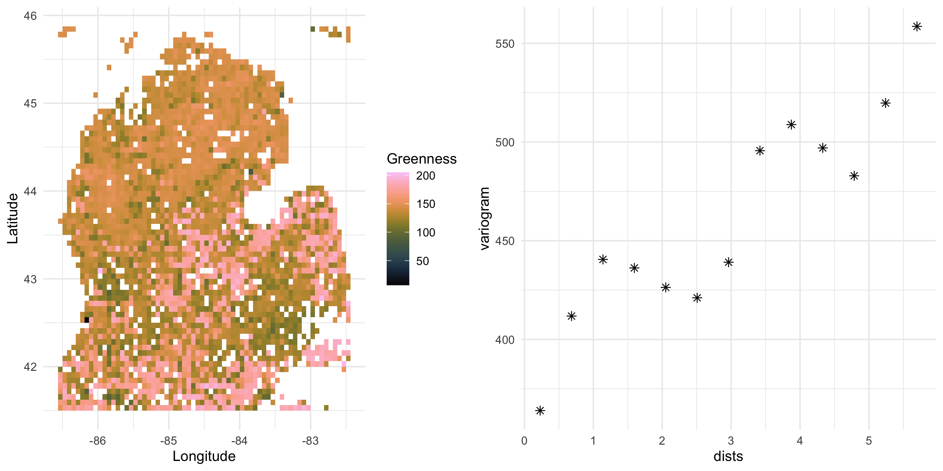 sv <- df %>% with(geoR::variog(data = Greenness, coords = cbind(Longitude, Latitude), messages=FALSE))