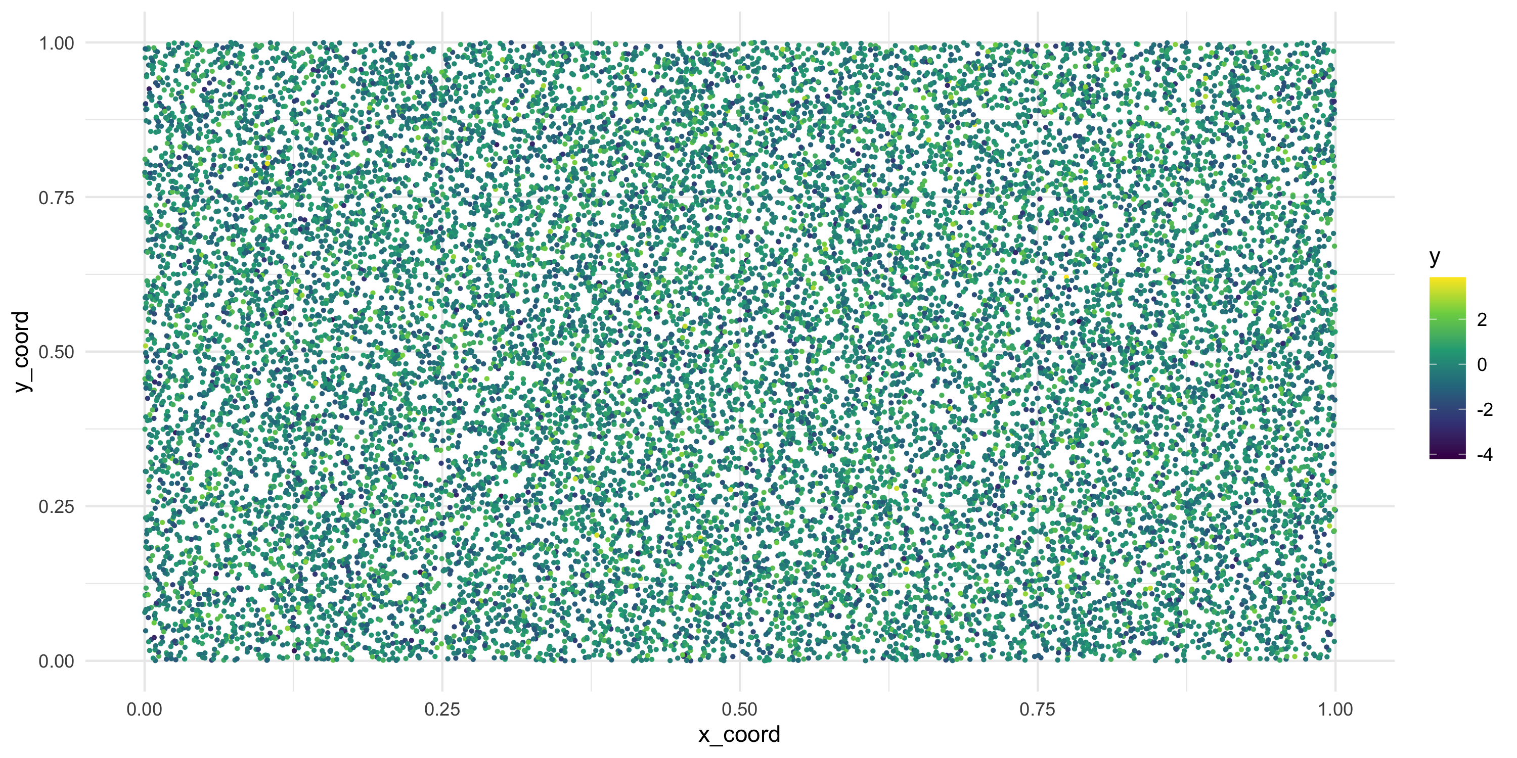 - This is just for simulation. Remember with point-referenced data the coordinates are given and non-random