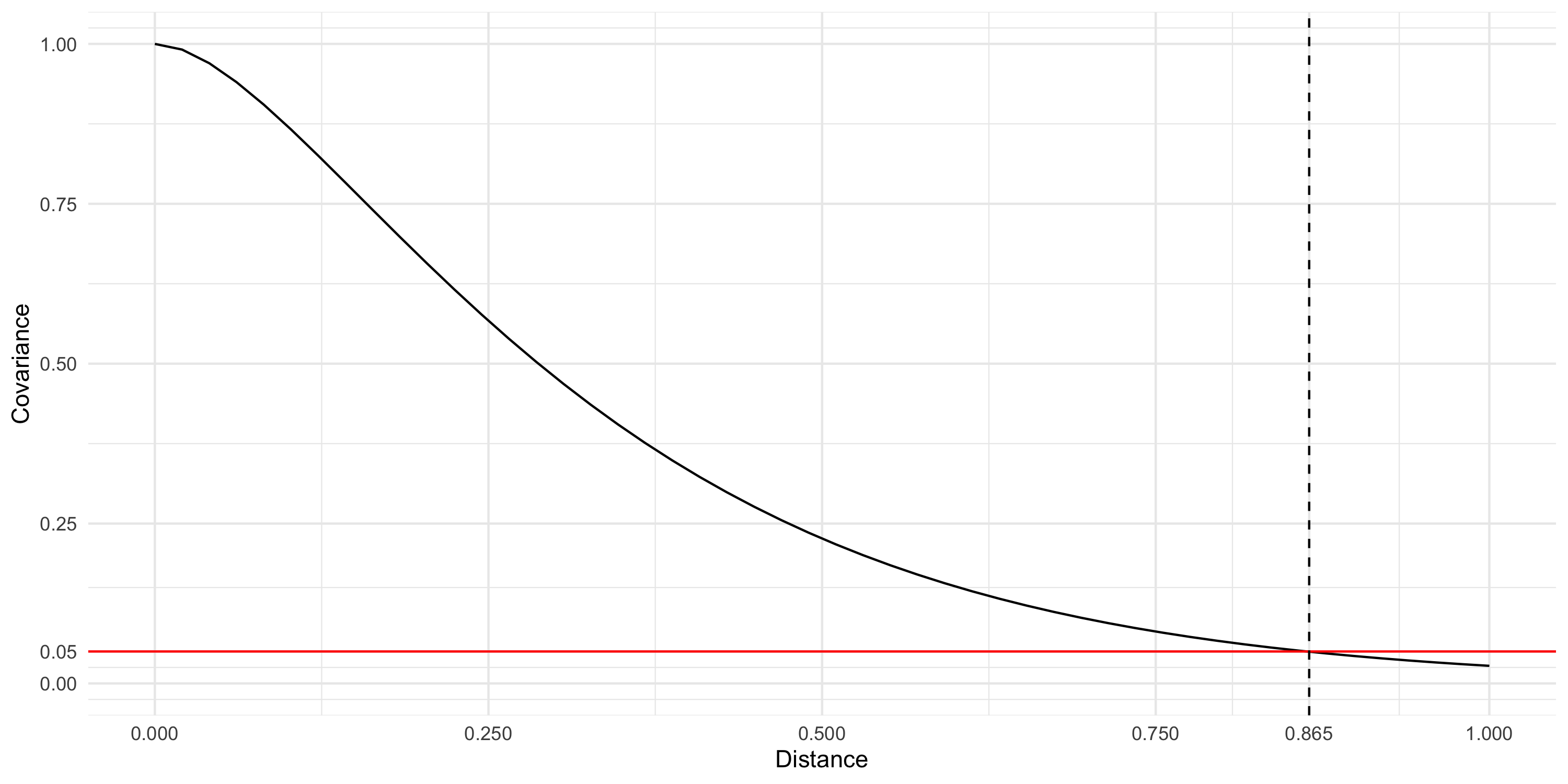 Example: exponential correlation function Cor(d) = \exp\{ -\phi d \}.