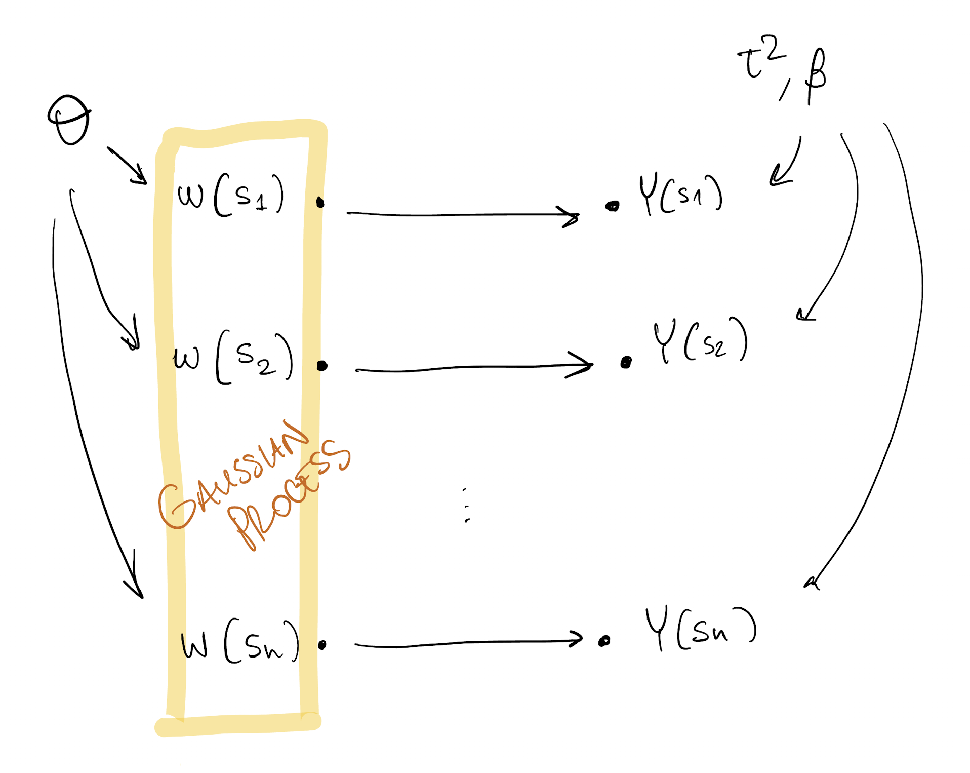 Y(s) = X(s)^\top \beta + w(s) + \varepsilon(s),\ \text{where}\ \varepsilon(s) \sim N(0, \tau^2) \quad \text{(iid)} In vector form: Y = X\beta + w + \varepsilon , where \varepsilon \sim N(0, \tau^2 I_n) .