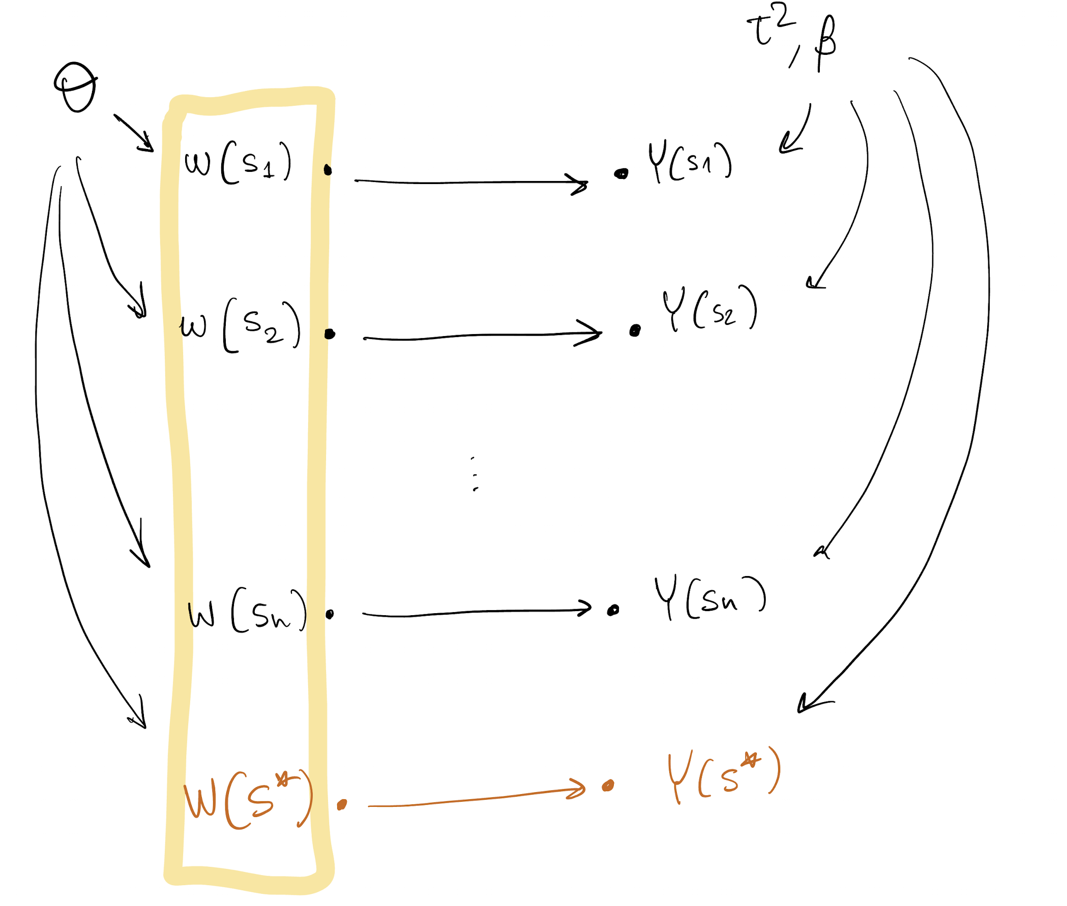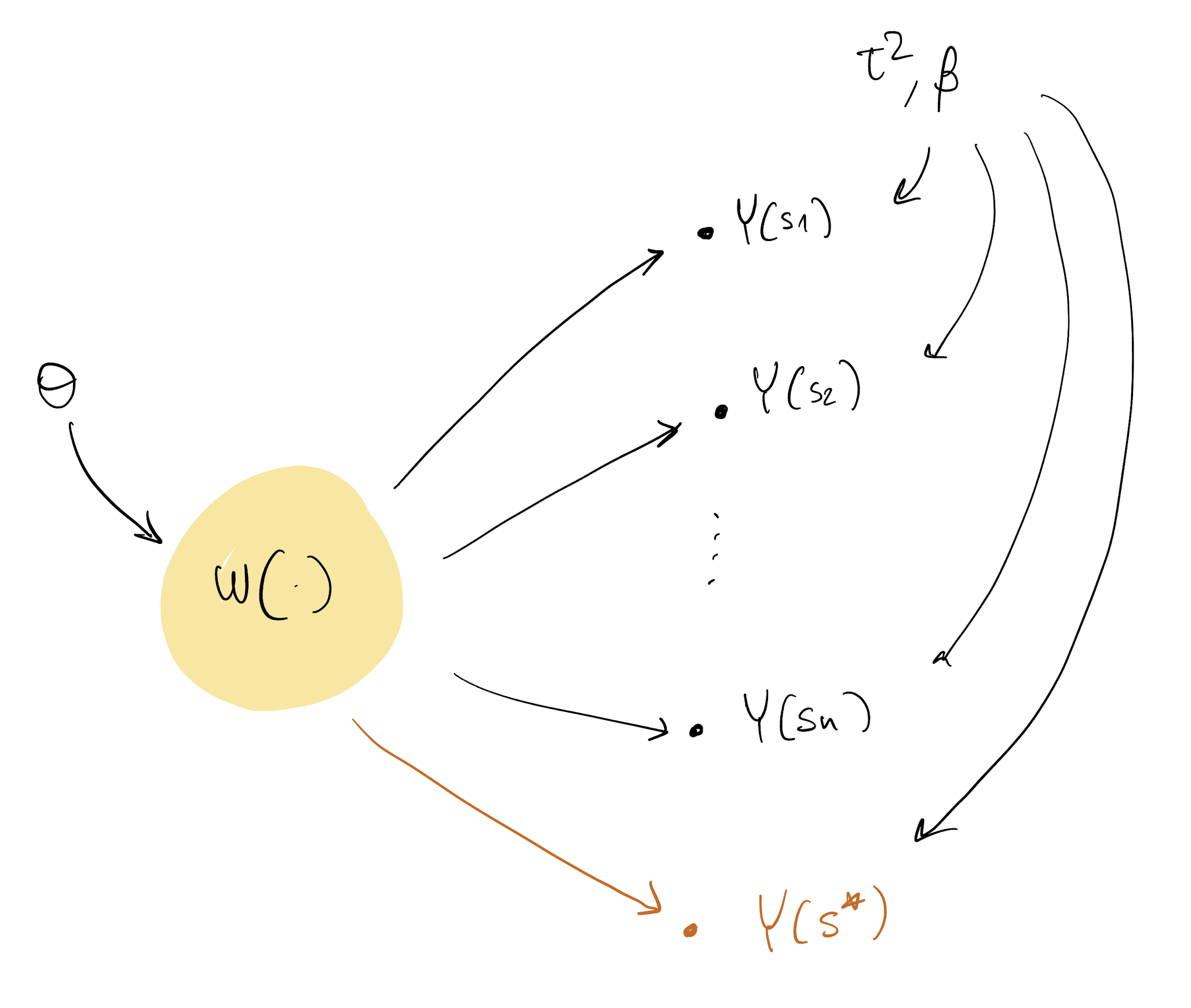 w(s) is the realization at s of a GP: we assume w(\cdot) \sim GP(0, \tau^2 C_{\theta}(\cdot, \cdot) ) where we have included \tau^2 for conjugacy