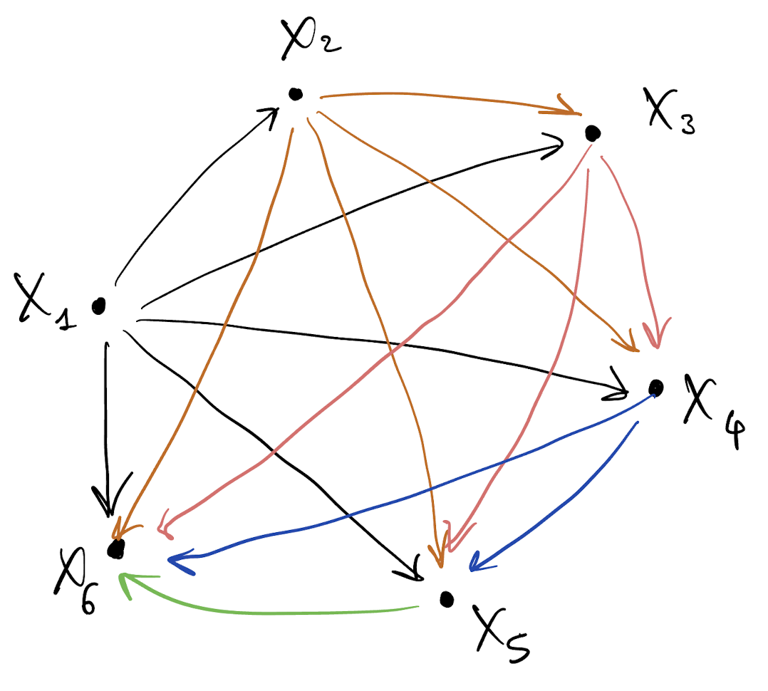- Draw a DAG for p(X_1, \dots, X_6) = p(X_1) p(X_2 |???) p(X_3 |???) \cdots p(X_6 | ???)